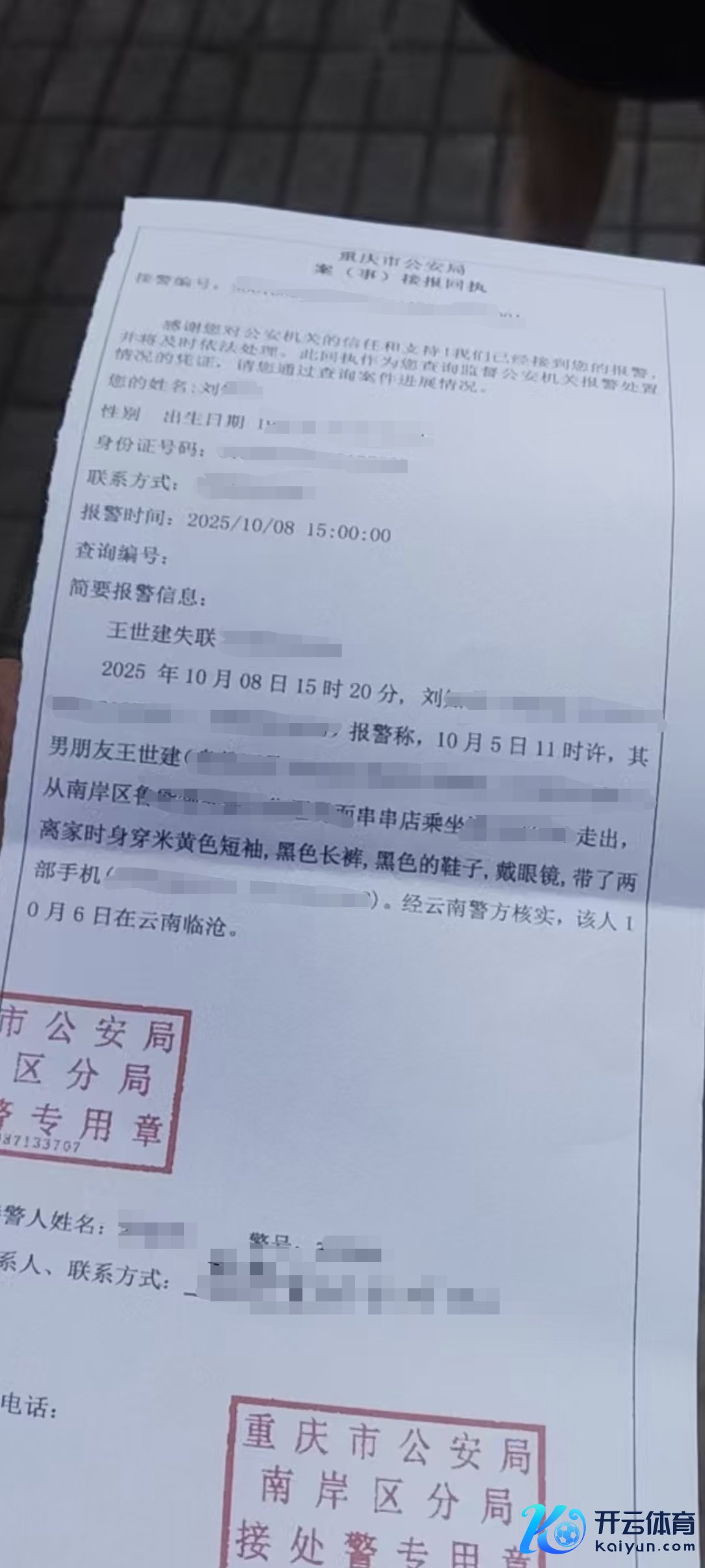 据重庆市南岸区公本分局出具的接警回捏单清醒,10月5日11时许,王世建从南岸区串串店搭车出走,带了两部手机。经云南警方核实,10月6日,王世建在云南临沧。