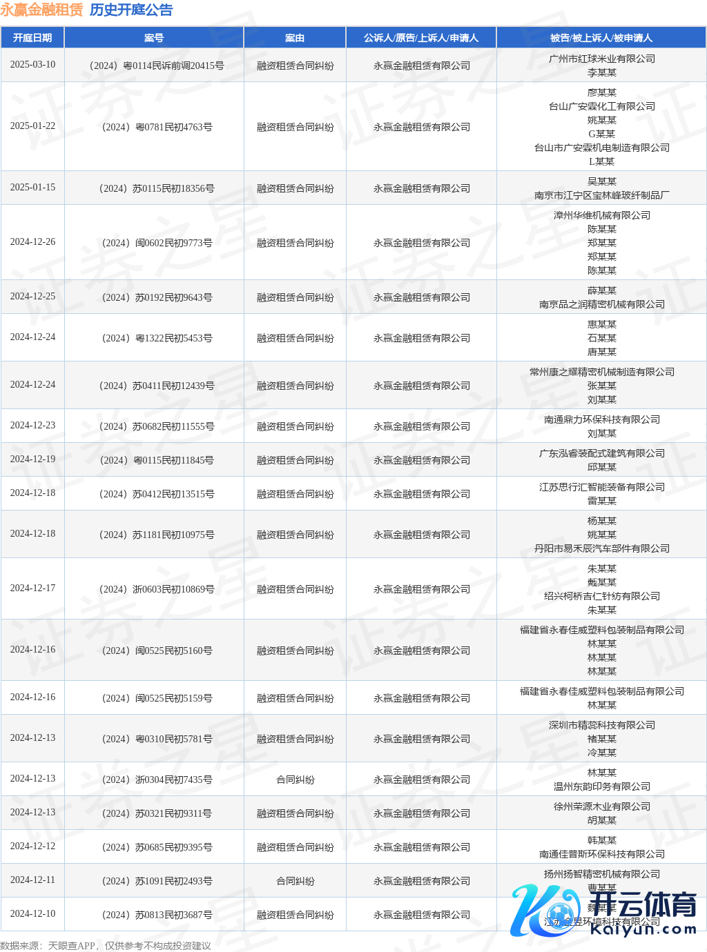 本站音书,凭证天眼查APP流露,近日公布了一则永赢金融租借有限公司手脚原告/上诉东谈主的开庭公告,详备现实如下: