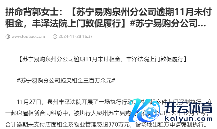 海报新闻记者贵重到,昨年11月27日,福建省泉州市丰泽区东谈主民法院曾开展了一场实行步履。据媒体报谈,该院在实行一齐房屋租借合同纠纷中,被实行东谈主泉州苏宁易购商贸有限公司自2023年12月至其时,共计过期未支付店面房钱及物业解决费超370万元,被地方出租方肯求强制实行。苏宁易购方面指出,虽每个月有尽量偿还,但确乎未足额偿还,并暗意集团相关负责东谈主已同肯求东谈主方面进行过协商,后续怎么偿还尚在议论中,瞻望下周提供决策。