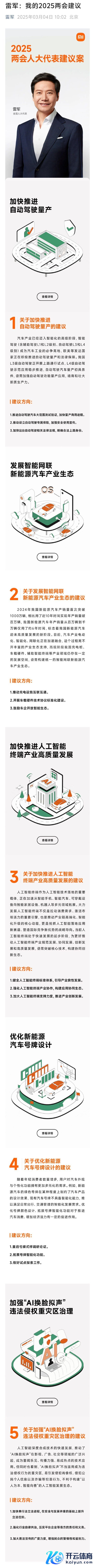 新浪科技讯 3月4日上昼音讯,2025寰宇两会至本日拉开帷幕,寰宇东说念主大代表、小米创办东说念主兼董事长兼CEO、金山软件董事长雷军公布了他的2025两会提倡:对于加速推动自动驾驶量产的提倡;对于发展智能网联新动力汽车产业生态的提倡;对于加速推动东说念主工智能结尾产业高质料发展的提倡;对于优化新动力汽车号牌盘算的提倡;对于加强“AI 换脸拟声”罪人侵权重灾地处理的提倡。