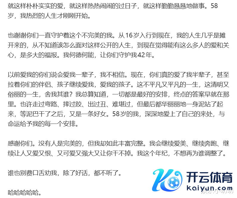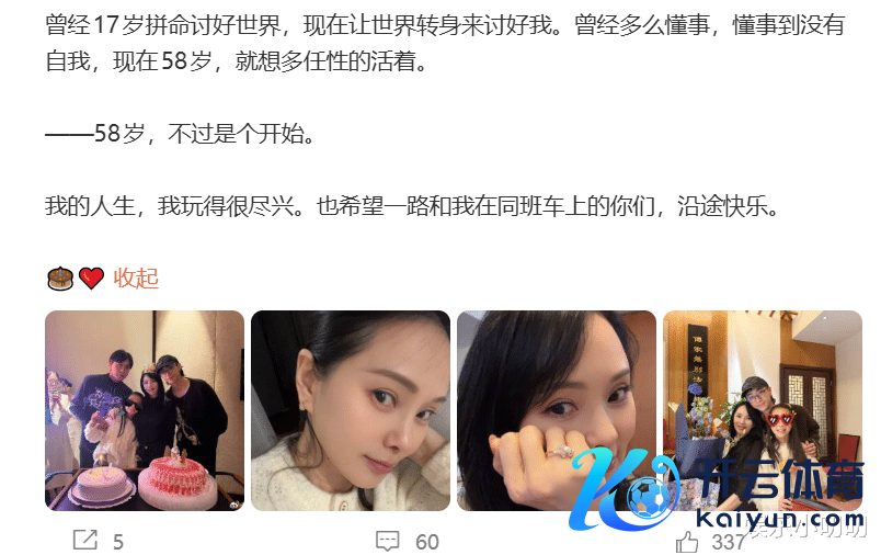 3月4日,是伊能静58岁生辰,说起这位姐姐真是是略带点阻难和佩服。58岁活得通透又洒脱,儿女双全,有我方的行状,有爱我方老公和婆家东谈主,姐姐可谓便是东谈主生赢家呀。生辰本日,伊能静依然罢免以往旧例,我方的小作文走起,不外这篇长文真是字里行间全是满满的幸福。用伊能静我方的话说,这是何等好意思好的年岁,浓烈的东谈主生刚启动呢。